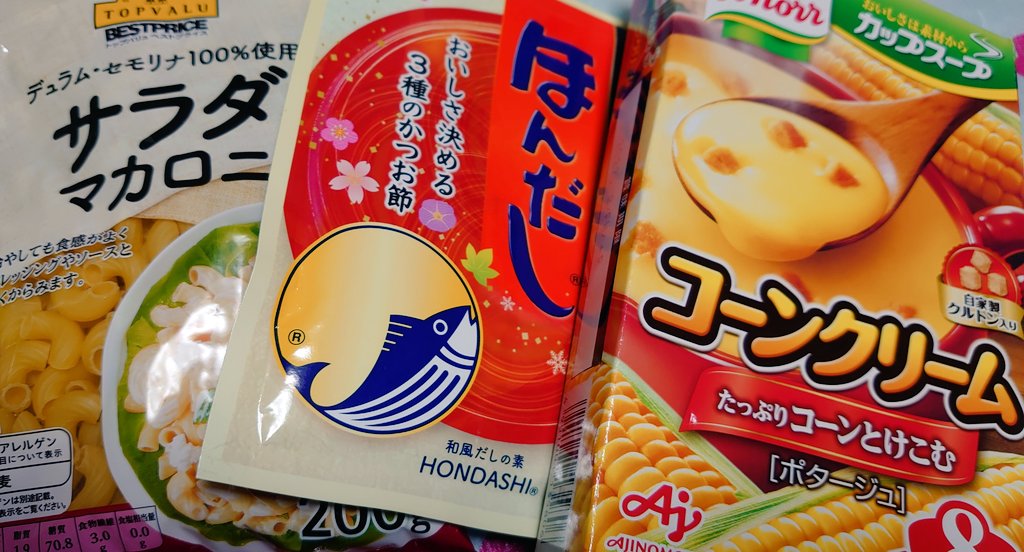 顆粒かつおだしと粉末クルトン入りコーンポタージュ、マカロニでアクセントを。